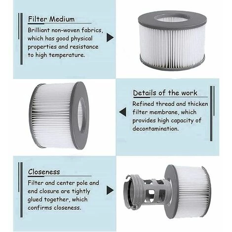 - 2.Les filtres Mspa en non-woven fabrics : un signe de qualité et de durabilité. L’ouverture est moulée par injection, avec une haute résistance, une membrane filtrante épaisse et une plus grande capacité d’aspiration. Elle aide à garder le spa propre.