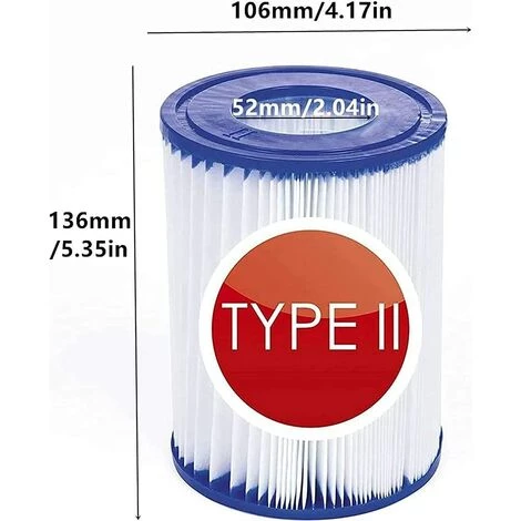 Élément filtrant Bestway II] : Ce filtre est spécialement conçu pour Bestway II. Taille du filtre de piscine : environ diamètre extérieur 4,17 pouces/106 mm, diamètre intérieur 2,04 pouces/52 mm, hauteur 5,35 pouces/136 mm, veuillez confirmer le modèle de pompe avant d’acheter.[Maintenir l’efficacité] : le filtre a une grande capacité de filtrage, une vitesse de filtrage rapide et une efficacité élevée. De plus, l’élément filtrant n’est pas facile à copier, évitant la pollution secondaire, vous permettant ainsi qu’à votre famille de profiter du temps de la piscine ensemble.[Bonne qualité]: un matériau ABS à haute résistance à la traction est utilisé. Le filtre média, la tige centrale et le couvercle sont reliés pour assurer une meilleure fixation du couvercle. L’ouverture est moulée par injection, avec un film épais, une résistance élevée et une forte absorption d’eau.[Compatible avec l’élément filtrant de type II] : Convient pour Bestway II type 58383 (530 gallons/heure, 2006 litres/heure) et 58386 (800 gallons/heure, 3028 litres/heure), 58117 (800 gallons/heure) pompe, 3028 litres/heure), 58386GS (800 gallons/heure, 3028 litres/heure), 58386GS (530 gallons/heure, 2006 litres/heure).[Remplacer ou nettoyer] : remplacez-le par un nouvel élément filtrant toutes les deux semaines pour de meilleurs résultats. Si nécessaire, frottez avec un nettoyant pour cartouche filtrante, puis lavez sous une forte pression d’eau pour éliminer les particules libres sur le tissu filtrant.