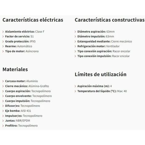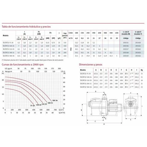 Nouvelle série SILEN S2, auto-amorçante 4 m auto-amorçante et ultra-silencieuse. Corps de pompe, pied, roue, support de joint et diffuseur en polypropylène. Arbre moteur en acier inoxydable AISI 431. Garniture mécanique spéciale en AISI 316. Boîtier du moteur en aluminium. Joints et roulements en NBR jusqu’à 160 ºC. Moteur avec protection IP55, avec ventilateur externe. Monophasé 1 x 230 V avec protecteur thermoampérométrique intégré et son condensateur correspondant. 10 000 heures Condensateur P2