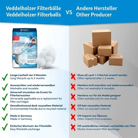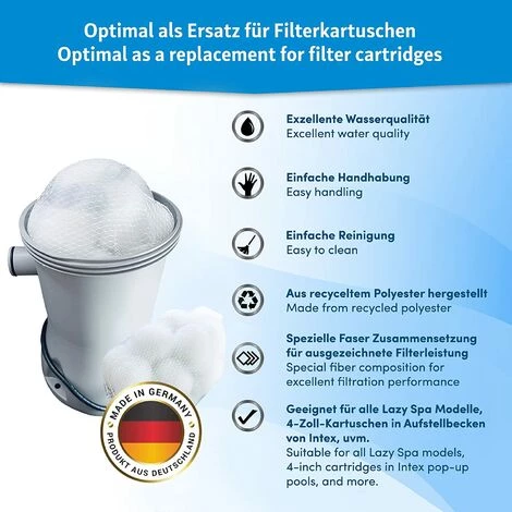 ✅FABRIQUÉ EN ALLEMAGNE : Nos boules filtrantes pour filtres à cartouche sont fabriquées en Allemagne. La composition spéciale des fibres assure une excellente performance du filtre et une bonne qualité de l’eau.