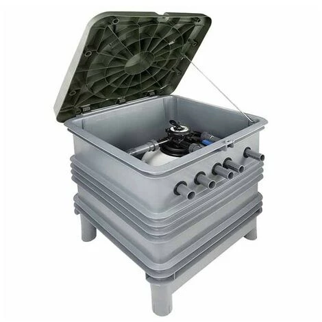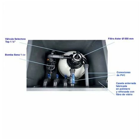 Il abrite un filtre Aster Ø 550 mm avec une vanne de sélection manuelle Flat top et une pompe de recirculation Sena 1 CV.